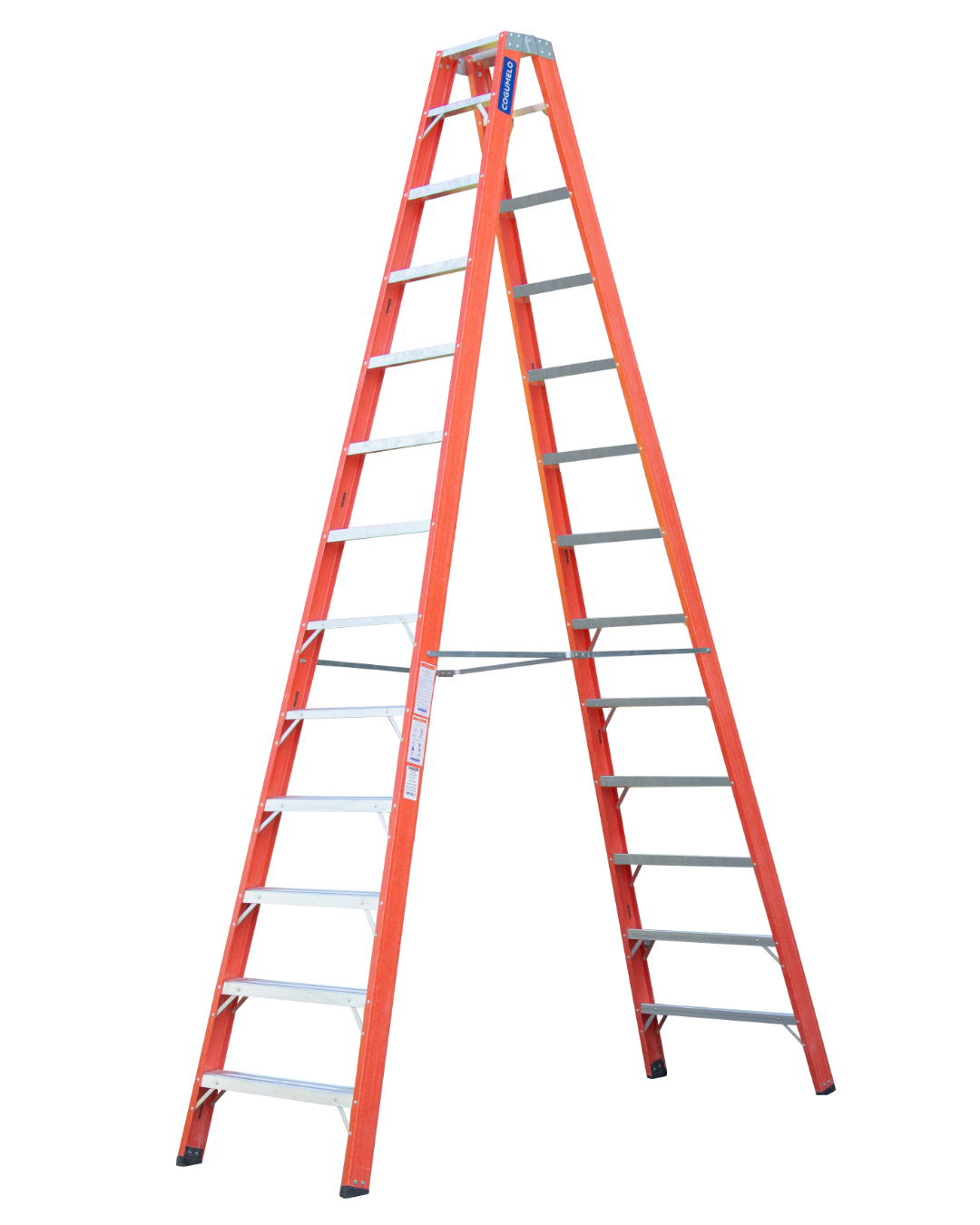 Perfis em U em Fibra de Vidro e degraus planos em alumínio com frisos antiderrapante. Possui topo de alumínio, articulações em aço galvanizado com sistema antibeliscão e sapatas de borracha antiderrapante.